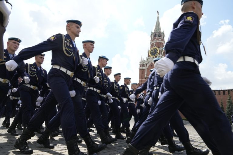Ruskí výsadkári pochodujú na Červenom námestí v rámci osláv Dňa výsadkárov a sviatku svätého proroka Eliáša. Ruské Výsadkové sily oslavujú 93. výročie svojho založenia. Moskva, 2. august 2023. Foto: SITA/AP.