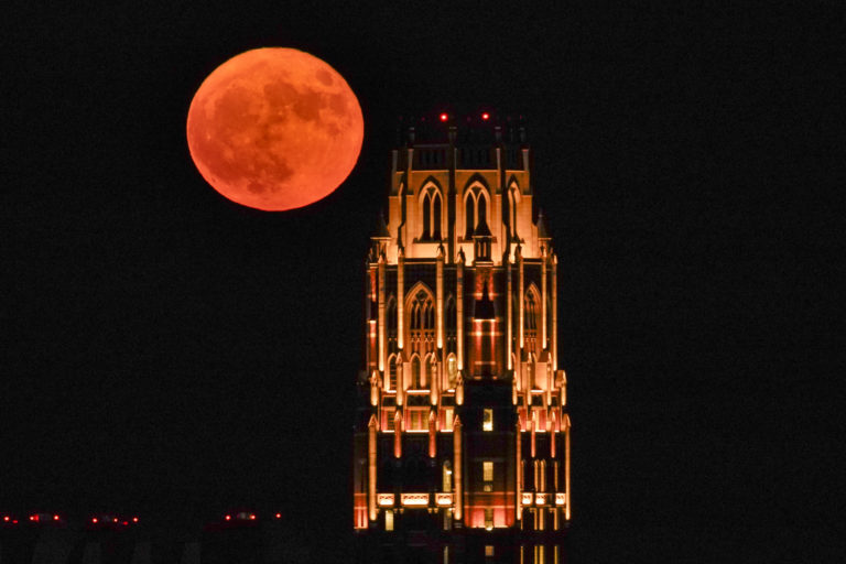 Supermesiac nad West End Tower na Vanderbiltovej univerzite v Nashville v noci z 1. na 2. augusta 2023. Foto: SITA/AP.