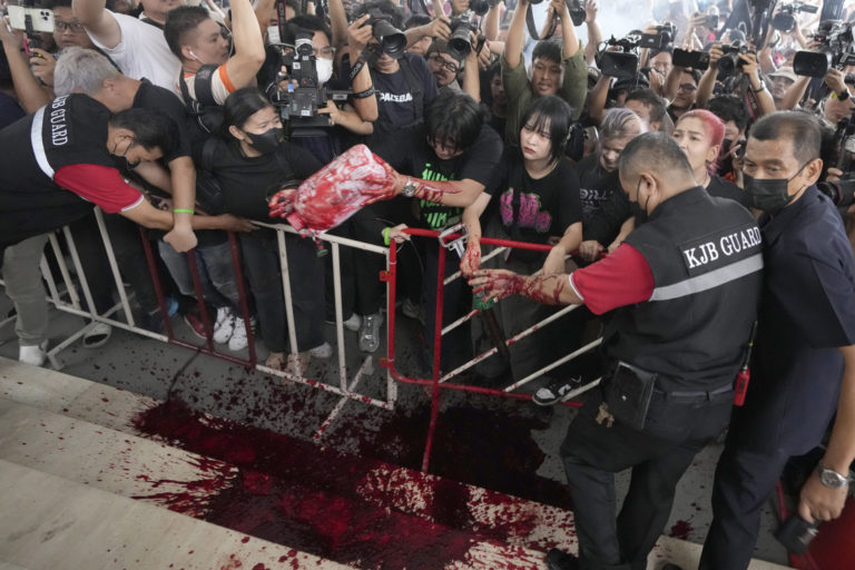 Priaznivci strany Move Forward striekajú červenú farbu počas protestu v centrále Pheu Thai Party v Bangkoku v Thajsku. Strana Move Forward, ktorá získala najviac kresiel v májových všeobecných voľbách, nebude súčasťou koalície, ktorá má zostaviť budúcu vládu uprostred silného odporu konzervatívnych zákonodarcov v súvislosti s navrhovanou reformou zákonov týkajúcich sa monarchie v krajine, uviedol v stredu jej bývalý koaličný partner (2. august 2023). Foto: SITA/AP