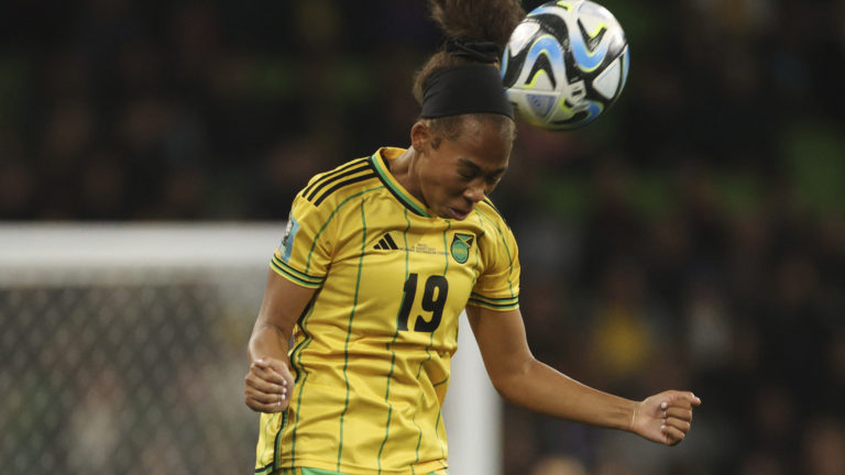 Jamajská reprezentantka Tiernny Wiltshire hlavičkuje loptu počas zápasu F-skupiny proti Brazílii na majstrovstvách sveta žien v austrálskom Melbourne (2. august 2023). Foto: SITA/AP