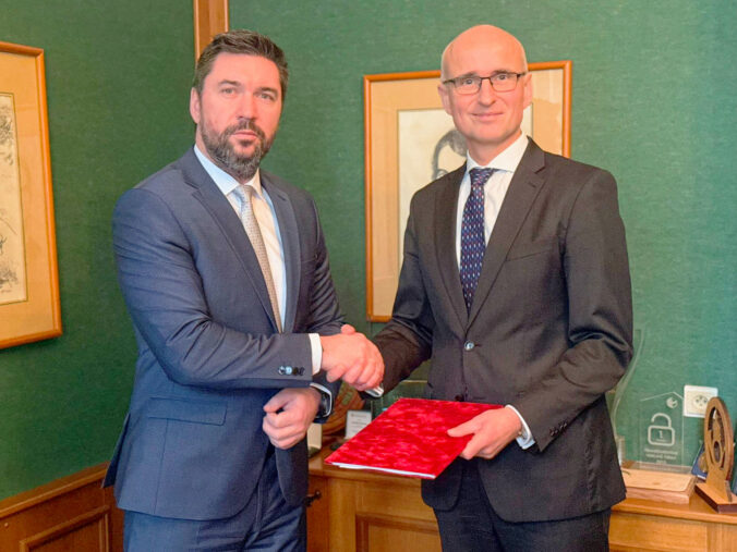 Zľava: Minister pôdohospodárstva a rozvoja vidieka SR Richard Takáč a nový generálny riaditeľ štátneho podniku Lesy Slovenskej republiky Boris Gregor počas jeho vymenovania do funkcie s účinnosťou od 3. februára 2026 v Banskej Bystrici. Banská Bystrica, 2. február 2026. Foto: SITA/MPRV SR
