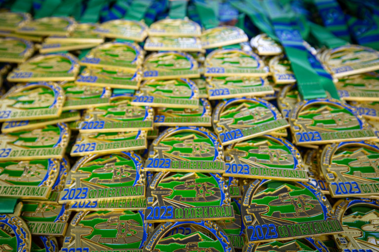 Medaily pre súťažiacich počas 345 km dlhého štafetového behu Od Tatier k Dunaju na Tyršovom nábreží v Bratislave. Foto: SITA/Jana Birošová.