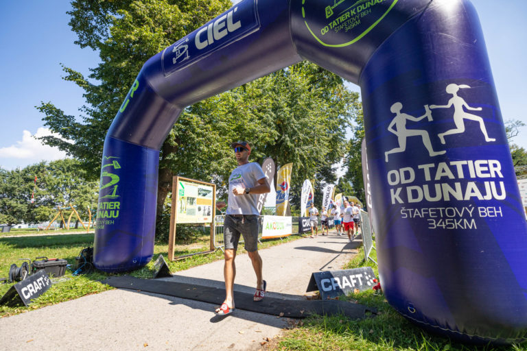 Súťažiaci dobiehajú do cieľa počas 345 km dlhého štafetového behu Od Tatier k Dunaju na Tyršovom nábreží v Bratislave. Foto: SITA/Jana Birošová.
