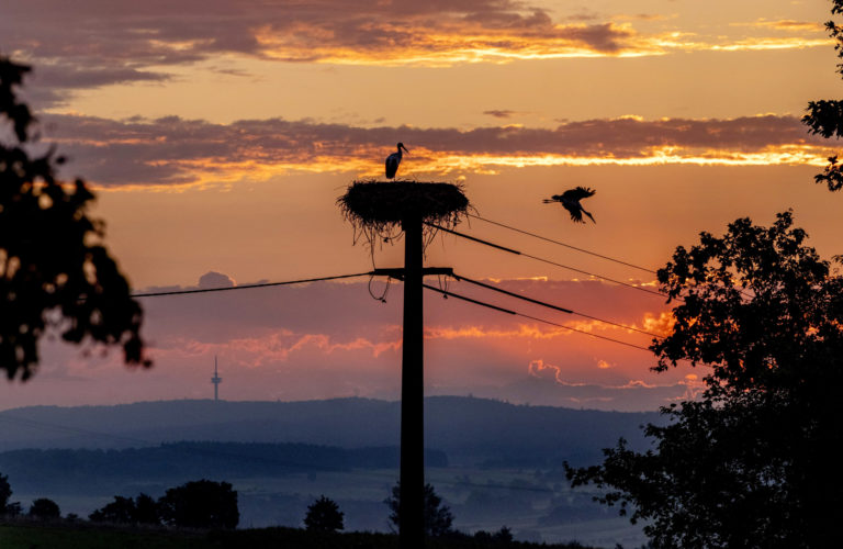 Bociany v nemeckom meste Neu-Anspach pred východom Slnka. Foto: SITA/AP.