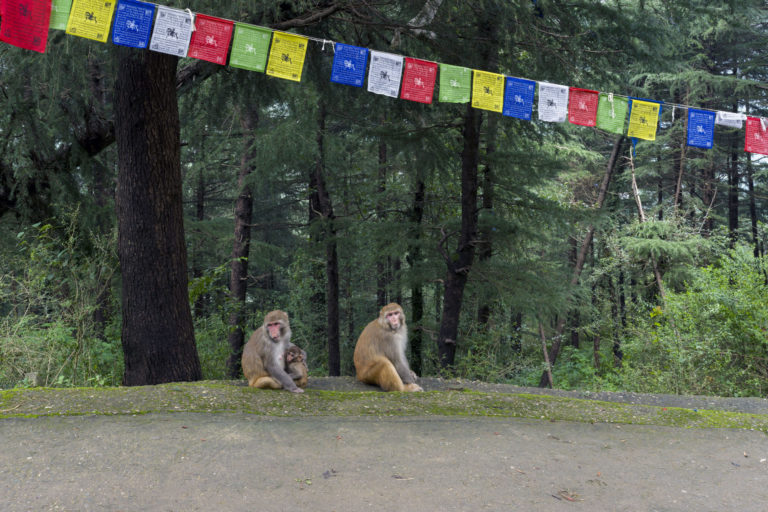 Makaky sedia pod radom tibetských buddhistických modlitebných vlajočiek v indickom Dharamshale. Foto: SITA/AP.