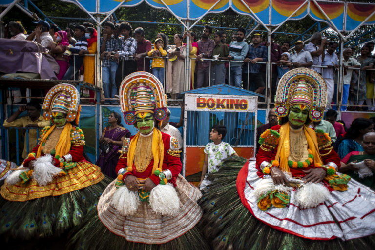 Účastníci desaťdňového festivalu Onam v indickom štáte Kerala, ktorý ospevuje bohatú kultúru a dedičstvo tohto štátu a je spojený s príbehom kráľa Mahabaliho. Onam je tiež časom radosti, farieb, hudby a tancu. Foto: SITA/AP.