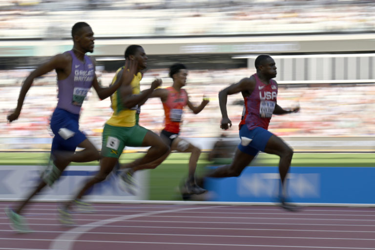 Američan Christian Coleman (vpravo) počas šprintu na 100 m na MS v atletike 2023 v Budapešti. Foto: SITA/AP.