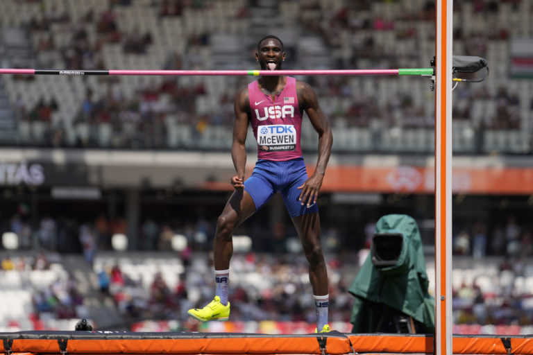 Američan Shelby Mcewen po svojom pokuse v skoku do výšky na MS v atletike 2023 v Budapešti. Foto: SITA/AP.