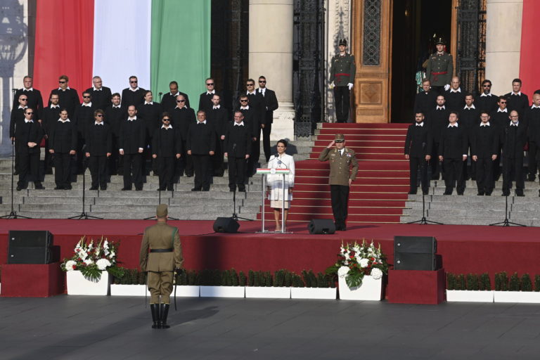 Maďarská prezidentka Katalin Nováková počas osláv sviatku svätého Štefana. Foto: Zoltan Mathe/MTI via AP.