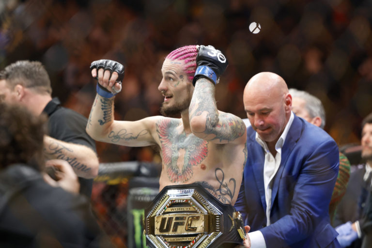 Sean O'Malleymu s opaskom po triumfe nad Aljamainom Sterlingom v súboji o titul bantamovej váhy na UFC 292. Foto: SITA/AP.