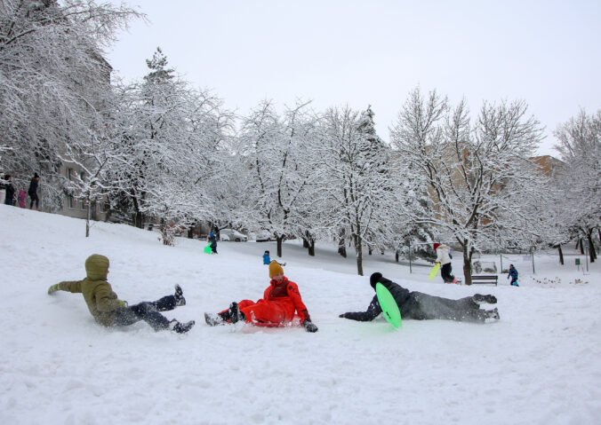 Deti sa počas sneženia sánkujú na snehových tanieroch v bratislavskej Dúbravke v posledný deň jarných prázdnin v Bratislavskom kraji. Bratislava, 20. február 2026. Foto: SITA/Andrea Mezeiová