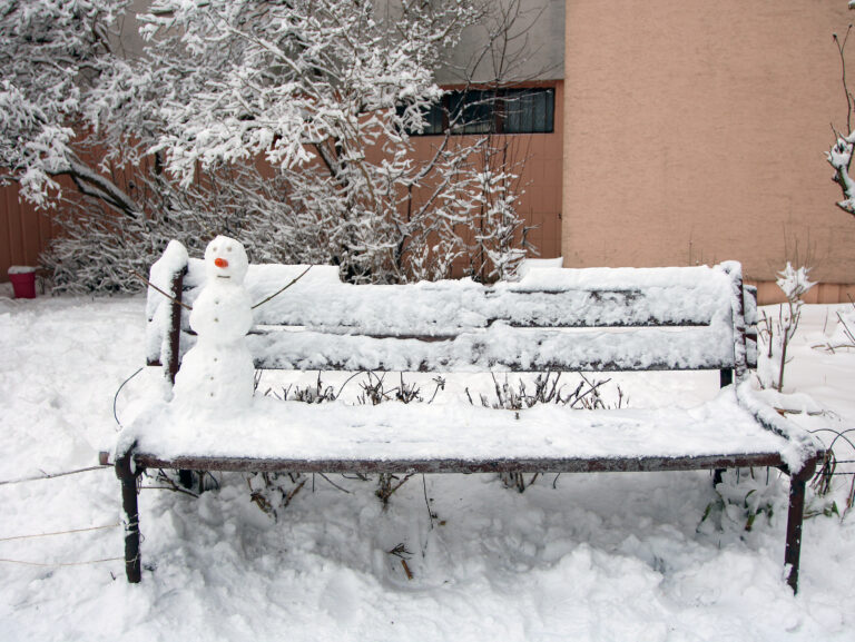 Snehuliak postavený na zasneženej lavičke počas sneženia v Bratislave. Bratislava, 20. február 2026. Foto: SITA/Andrea Mezeiová