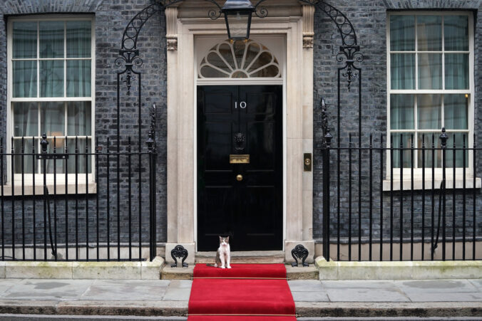 Larry, kocúr a hlavný lovec myší na úrade britskej vlády (Chief Mouser to the Cabinet Office), sedí na červenom koberci predtým, ako britský premiér Keir Starmer privítal indonézskeho prezidenta Prabowa Subianta na Downing Street 10 v Londýne. Anglicko, 20. januára 2026. Foto: AP Photo/Alberto Pezzali