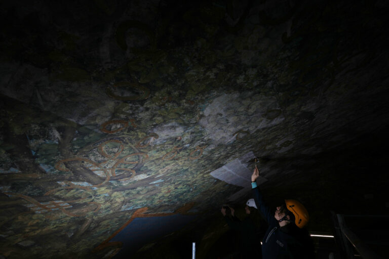 Marina Vece pracuje so svojou kolegyňou na obnove sály Sala delle Asse, ktorá je súčasťou novovytvorených itinerárov Leonarda da Vinciho v milánskom hrade Sforza. Taliansko, 20. januára 2026. Foto: AP Photo/Antonio Calanni