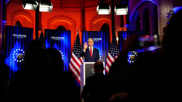 Americký minister financií Scott Bessent prednáša prejav v USA House počas výročného zasadnutia Svetového ekonomického fóra v Davose. Švajčiarsko, 20. januára 2026. Foto: AP Photo/Markus Schreiber