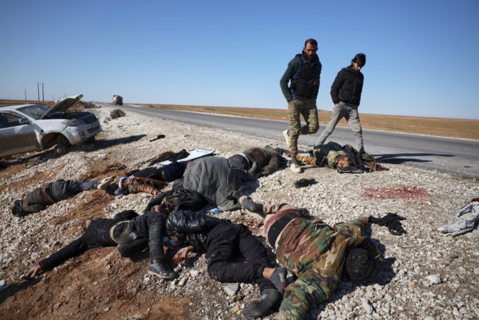 Bojovníci kmeňových milícií spojenci sýrskej vlády si prezerajú telá ustupujúcich bojovníkov Sýrskych demokratických síl (SDF) ležiace na kraji cesty medzi vládou kontrolovanou Rakkou a Hasakehom kontrolovaným SDF v severovýchodnej Sýrii. Sýria, 20. januára 2026. Foto: AP Photo/Omar Albam