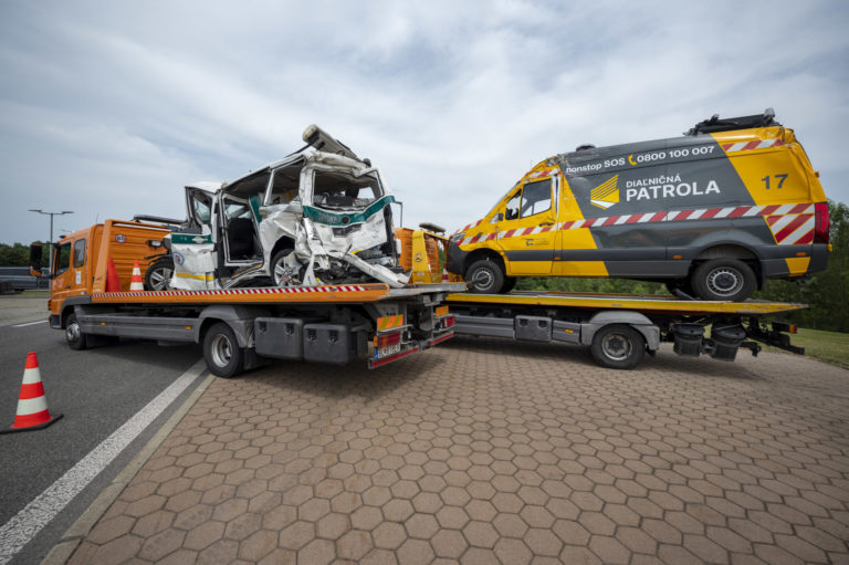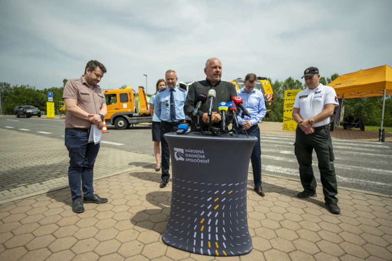 Sprava: Generálny riaditeľ NDS Filip Macháček, štátny tajomník Ministerstva dopravy SR Igor Choma a prezident HaZZ Adrián Mifkovič počas brífingu ministerstva dopravy, Hasičského a záchranného zboru, Prezídia Policajného zboru a Národnej diaľničnej spoločnosti na odpočívadle Zlaté piesky na