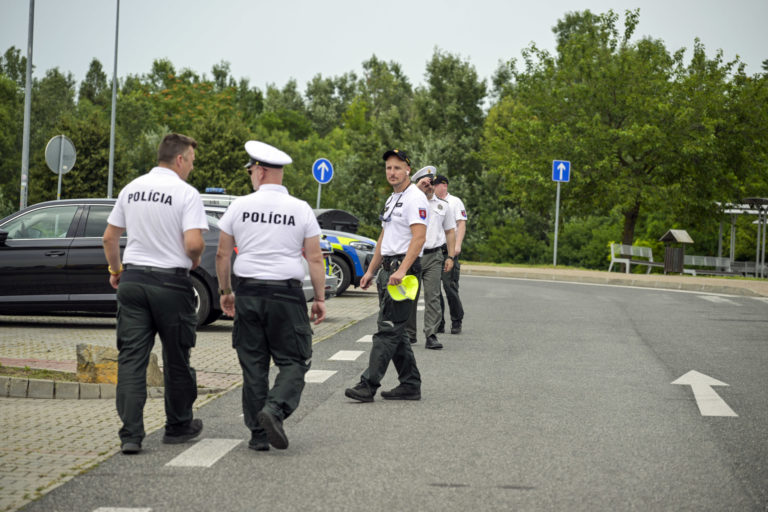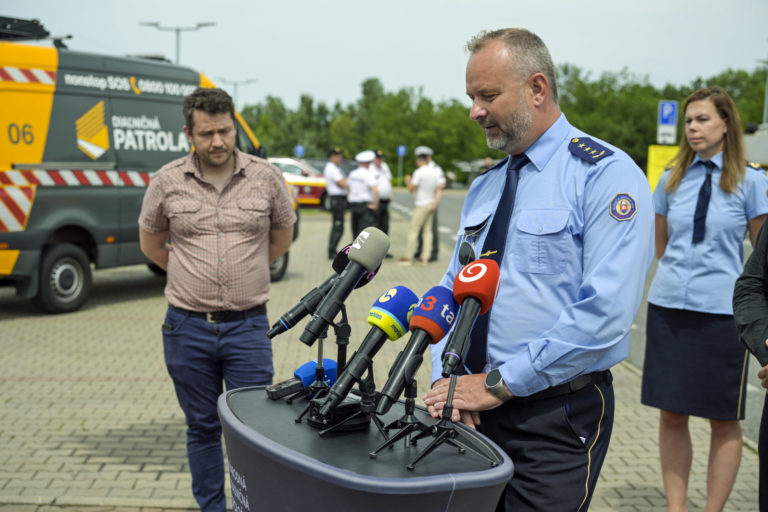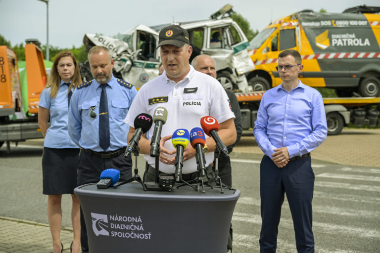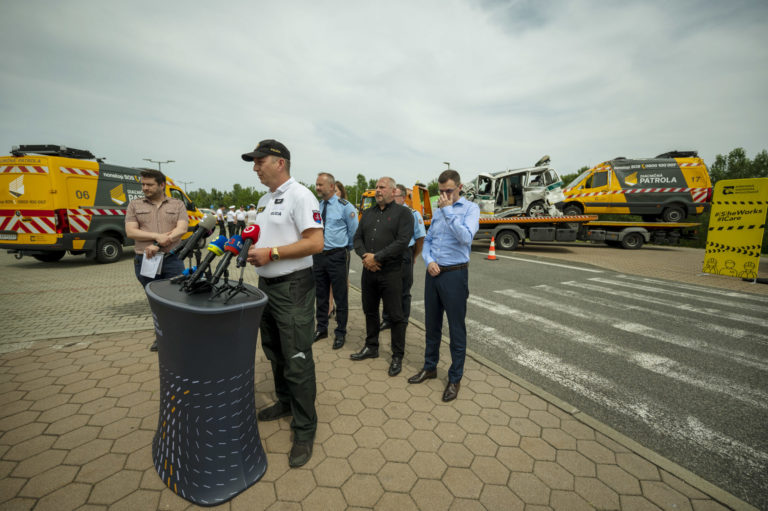 Atmosféra počas brífingu ministerstva dopravy, Hasičského a záchranného zboru, Prezídia Policajného zboru a Národnej diaľničnej spoločnosti na odpočívadle Zlaté piesky na tému: Bezpečnosť povolaní pracujúcich na cestách. Bratislava, 20. jún 2024. Foto: SITA/Milan Illík.