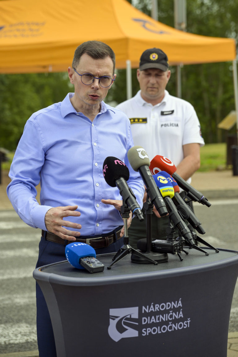 Generálny riaditeľ NDS Filip Macháček (vľavo) počas brífingu ministerstva dopravy, Hasičského a záchranného zboru, Prezídia Policajného zboru a Národnej diaľničnej spoločnosti na odpočívadle Zlaté piesky na tému: Bezpečnosť povolaní pracujúcich na cestách. Bratislava, 20. jún 2024. Foto: SITA/Milan Illík.