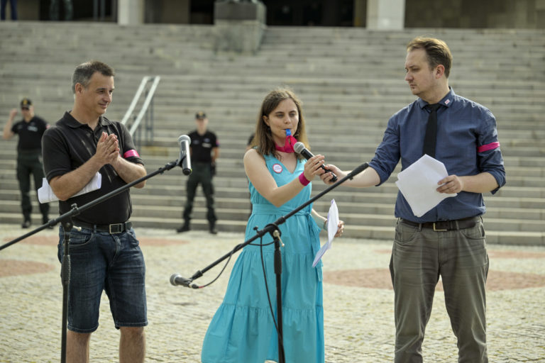 Zľava: Investigatívny novinár Ivan Brada, špecialistka vývoju programov Paula Maľárová a reportéír Vladimír Amrich počas štrajku zamestnancov RTVS, ktorý zvolala Iniciatíva za verejnoprávnosť a nezávislosť pred parlamentom. Bratislava, 20. jjún 2024. Foto: SITA/Milan Illík.