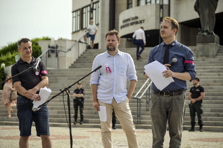 Zľava: Investigatívny novinár Ivan Brada, šéf dramaturg digitálnych rádii Tomáš Bartoněk a reportér Vladimír Amrich počas štrajku zamestnancov RTVS, ktorý zvolala Iniciatíva za verejnoprávnosť a nezávislosť pred parlamentom. Bratislava, 20. jún 2024. Foto: SITA/Milan Illík.