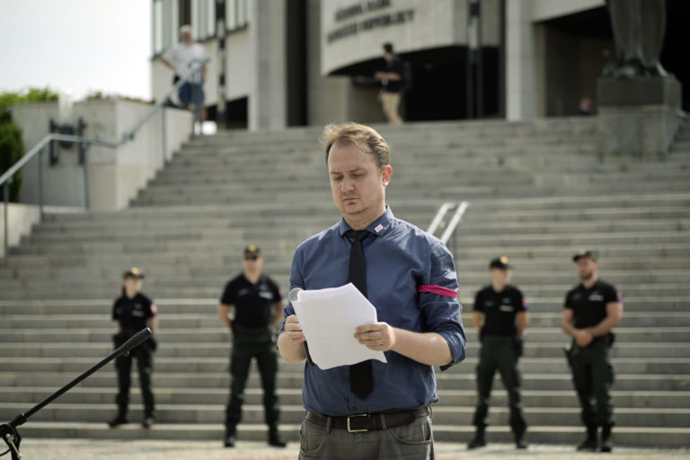 Reportér RTVS Vladimír Amrich počas štrajku zamestnancov RTVS, ktorý zvolala Iniciatíva za verejnoprávnosť a nezávislosť pred parlamentom. Bratislava, 20. jún 2024. Foto: SITA/Milan Illík.