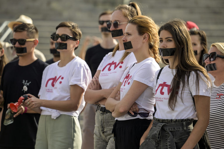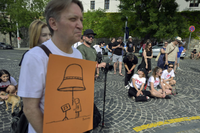 Štrajk zamestnancov RTVS, ktorý zvolala Iniciatíva za verejnoprávnosť a nezávislosť pred parlamentom. Bratislava, 20. jún 2024. Foto: SITA/Milan Illík.