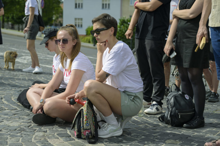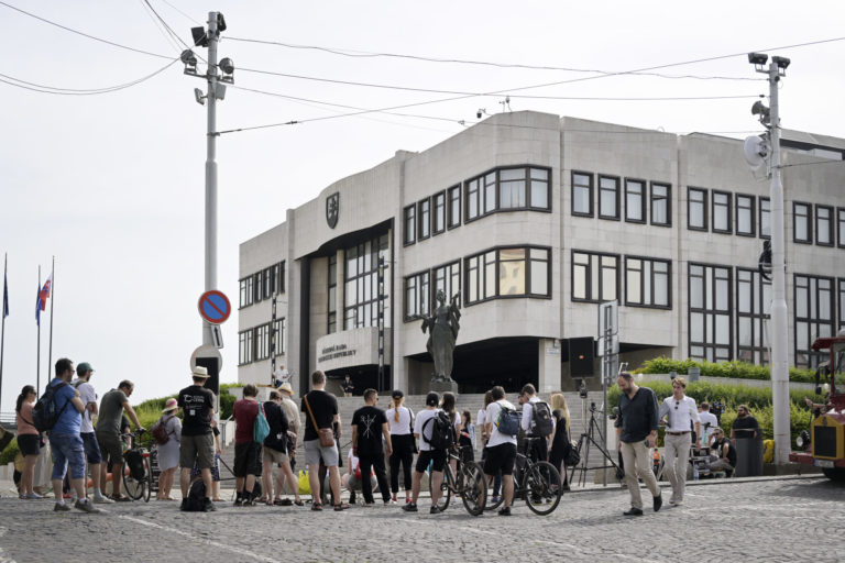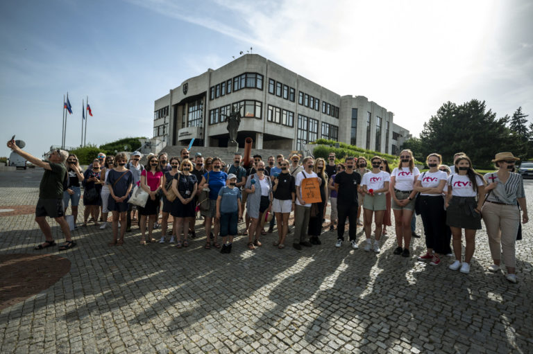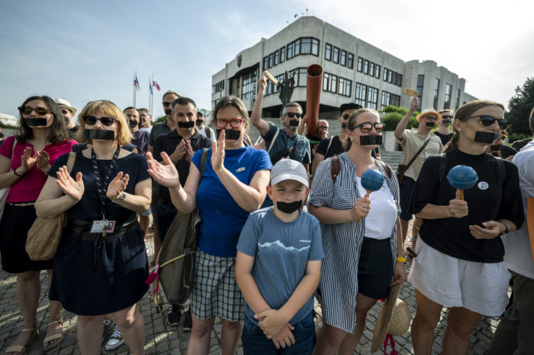 Atmosféra počas štrajku zamestnancov RTVS, ktorý zvolala Iniciatíva za verejnoprávnosť a nezávislosť pred parlamentom. Bratislava, 20. jún 2024. Foto: SITA/Milan Illík.