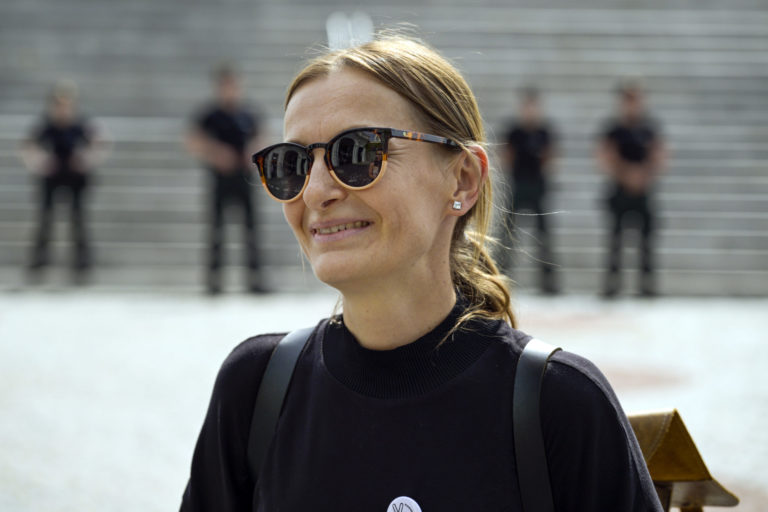 Investigatívna novinárka Martina Kubániová počas štrajku zamestnancov RTVS, ktorý zvolala Iniciatíva za verejnoprávnosť a nezávislosť pred parlamentom. Bratislava, 20. jún 2024. Foto: SITA/Milan Illík.
