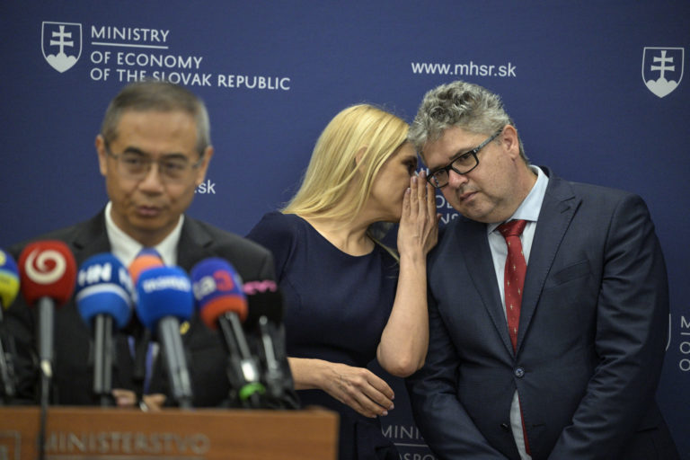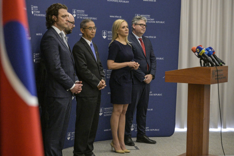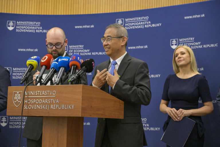 Zľava: Prezident spločnosti Gotion EMEA Steven Cai, podpredsedníčka vlády a ministerka hospodárstva Denisa Saková a konateľ MH Invest Adrián Jenčo počas tlačovej besedy Ministerstva hospodárstva (MH) SR na tému: MH SR bude informovať o výsledkoch rokovania vlády SR a o rokovaniach so strategickým investorom. Bratislava, 20. jún 2024. Foto: SITA/Milan Illík