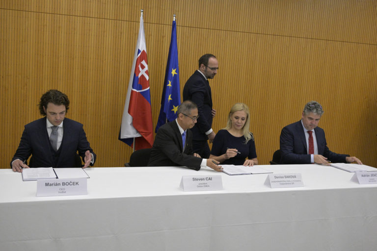 Zľava v popredí: Spoluzakladateľ CEO InoBat Marián Boček, prezident spločnosti Gotion EMEA Steven Cai, podpredsedníčka vlády a ministerka hospodárstva Denisa Saková a konateľ MH Invest Adrián Jenčo počas podpisu investičnej zmluvy v rámci tlačovej besedy Ministerstva hospodárstva (MH) SR na tému: MH SR bude informovať o výsledkoch rokovania vlády SR a o rokovaniach so strategickým investorom. Bratislava, 20. jún 2024. Foto: SITA/Milan Illík