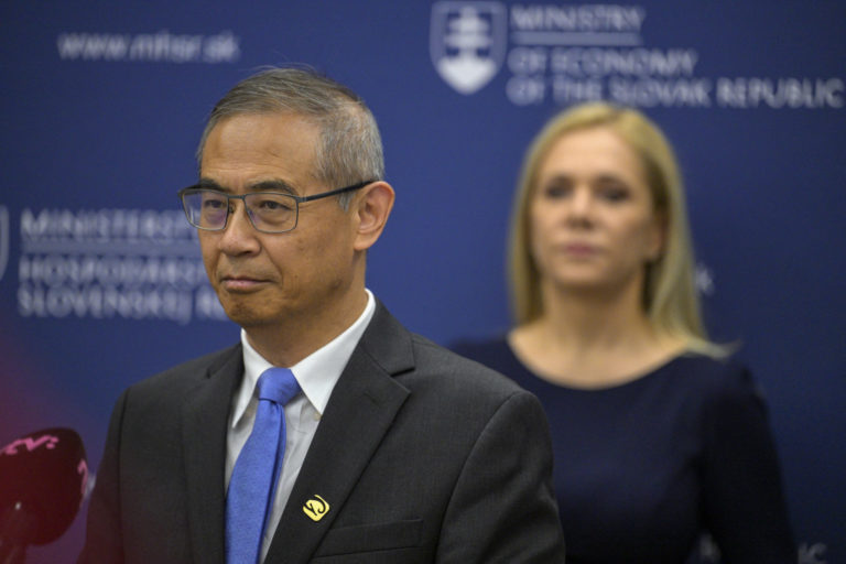 Sprava: Podpredsedníčka vlády a ministerka hospodárstva Denisa Saková a prezident spločnosti Gotion EMEA Steven Cai počas tlačovej besedy Ministerstva hospodárstva (MH) SR na tému: MH SR bude informovať o výsledkoch rokovania vlády SR a o rokovaniach so strategickým investorom. Bratislava, 20. jún 2024. Foto: SITA/Milan Illík