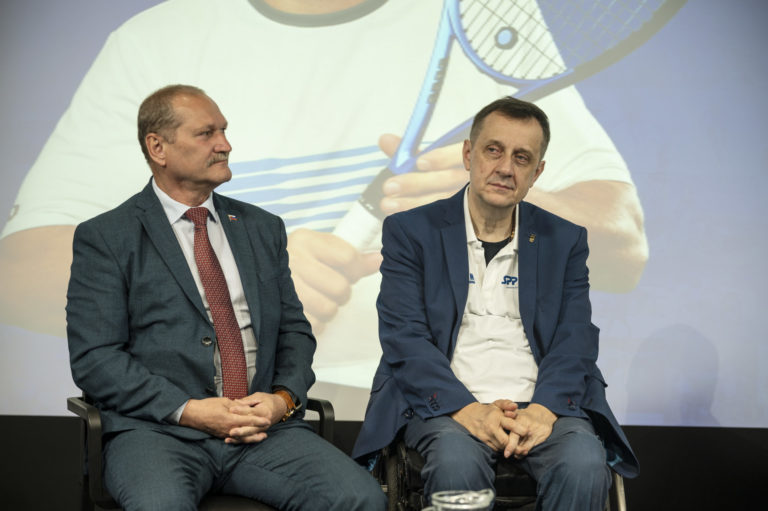 Sprava: Predseda Slovenského paralympijského výboru Ján Riapoš a štátny tajomník Ministerstva cestovného ruchu a športu SR Peter Krišanda počas tlačovej konferencie Slovenského paralympijského výboru (SPV) na tému: 100 dní do začiatku paralympijských hier v Paríži v Slovenskom olympijskom a športovom múzeu v Bratislave. Bratislava, 20. máj 2024. Foto: SITA/Milan Illík