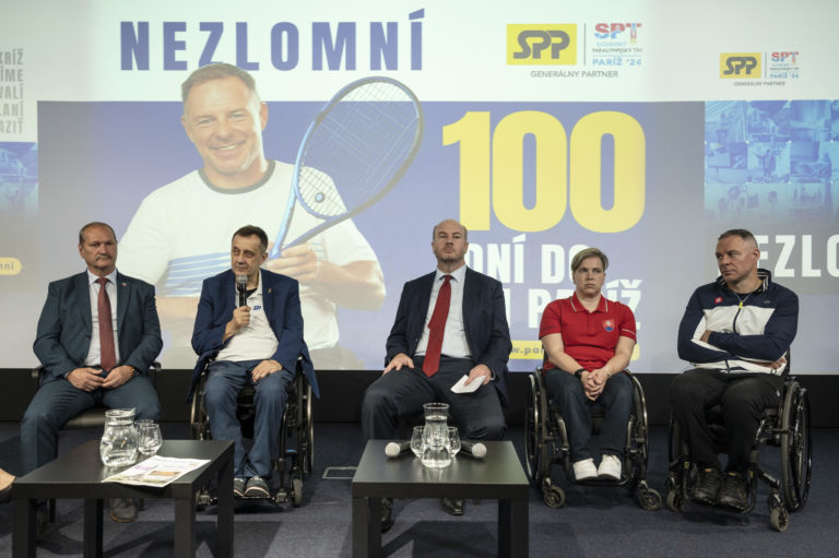 Sprava: Paralympijský tenista a tvár kampane Nezlomní Tomáš Masaryk, slovenská paralympijská reprezentantka v športovej streľbe Veronika Vadovičová, prvý radca francúzskeho veľvyslanectva Jacques de Noray, predseda Slovenského paralympijského výboru Ján Riapoš, štátny tajomník ministerstva cestovného ruchu a športu Peter Krišanda, spevák Peter Cmorík a manažér Petra Cmoríka Krištóf Kiss počas tlačovej konferencie Slovenského paralympijského výboru (SPV) na tému: 100 dní do začiatku paralympijských hier v Paríži v Slovenskom olympijskom a športovom múzeu v Bratislave. Foto: archívne, SITA/Milan Illík
