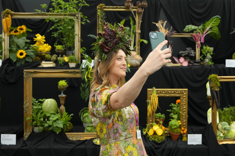 Žena si robí selfie v stánku She Grows Veg The Heirloom Seed Company na Chelsea Flower Show v Londýne. Foto: SITA/AP