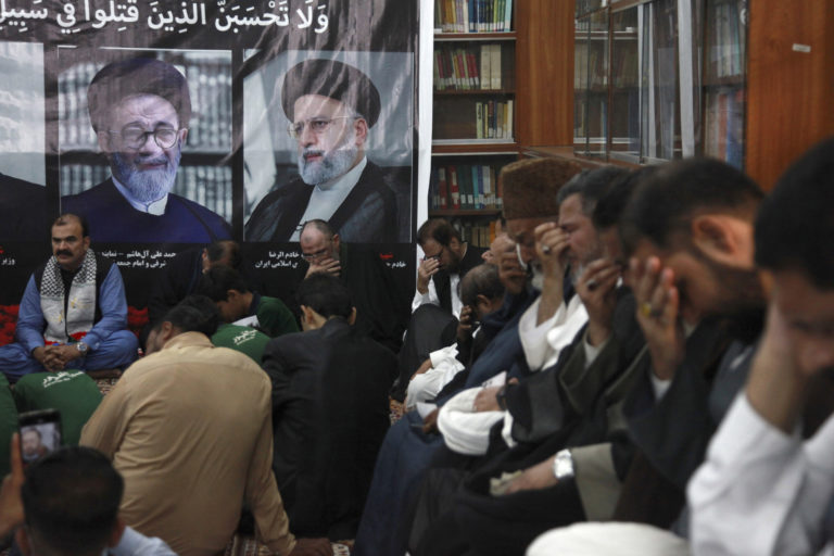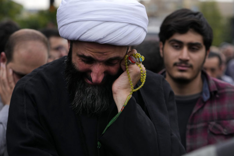 Duchovný plače počas smútočného obradu za iránskeho prezidenta Ebrahima Raisiho na námestí Vali-e-Asr v centre Teheránu. Foto: SITA/AP