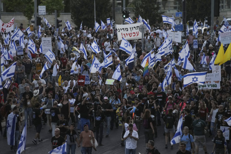 People protest against Israeli Prime Minister Benjamin Netanyahu's government and call for the release of hostages held in the Gaza Strip by the Hamas militant group, outside the Knesset, Israel's parliament in Jerusalem on Monday, May 20, 2024. (AP Photo/Mahmoud Illean)