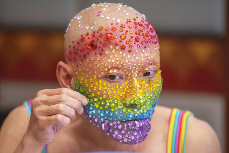 Člen LGBTQ si zdobí tvár pred tlačovou konferenciou v Bangkoku v Thajsku. Foto: SITA/AP