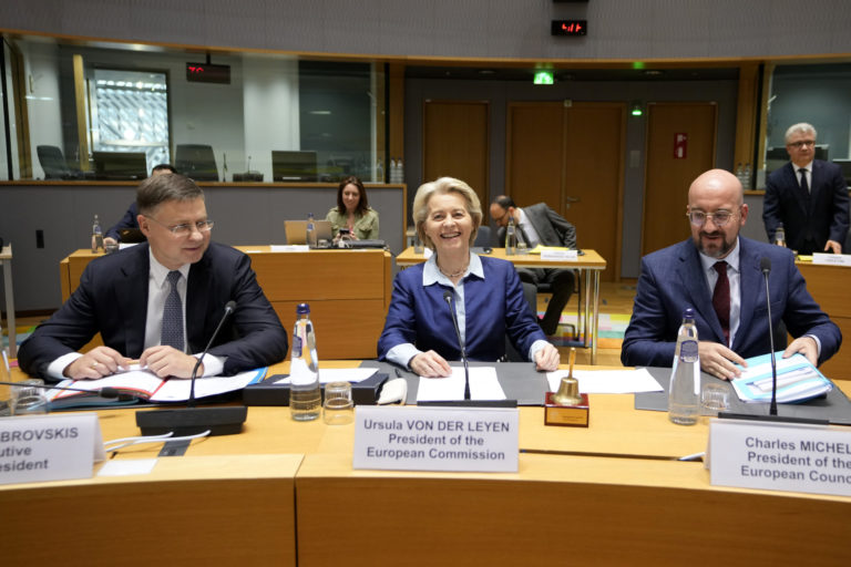európsky komisár pre hospodárstvo Valdis Dombrovskis, predsedníčka Európskej komisie Ursula von der Leyen a predseda Európskej rady Charles Michel na samite v budove Európskej rady v Bruseli, v stredu 20. marca 2024. Foto: SITA/AP
