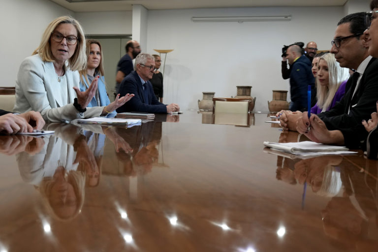 Hlavná koordinátorka OSN pre humanitárnu pomoc a obnovu pre Gazu Sigrid Kaagová (vľavo) počas stretnutia s cyperským ministrom zahraničných vecí Constantinosom Kombosom (vpravo) v dome ministerstva zahraničných vecí v hlavnom meste Nikózia na Cypre v stredu 20. marca 2024. Foto: SITA/AP