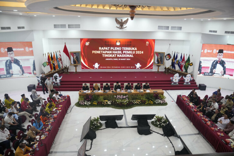 Predseda všeobecnej volebnej komisie, Hasyim Asyari, vedie stretnutie s cieľom potvrdiť výsledky prezidentských a legislatívnych volieb zo 14. februára v kancelárii komisie v Jakarte v Indonézii, v stredu 20. marca 2024. Foto: SITA/AP