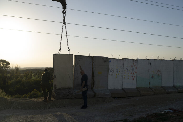 Stavba betónového múru v oblasti pred materskou školou, ktorá sa nachádza v blízkosti izraelsko-gazskej hranice v izraelskom meste Sderot, v stredu 20. marca 2024. Foto: SITA/AP