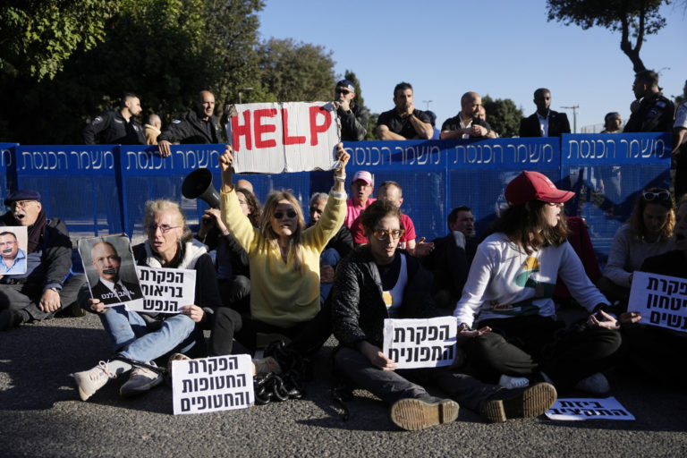 Protivládni demonštranti blokujú vstup do Knesetu, izraelského parlamentu v Jeruzaleme, v stredu 20. marca 2024. Foto: SITA/AP