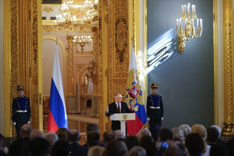 Ruský prezident Vladimir Putin sa v stredu 20. marca 2024 stretáva so svojimi splnomocnenými zástupcami pre prezidentskú volebnú kampaň v Andrejevského sále Veľkého kremeľského paláca v Moskve v Rusku. Foto: SITA/AP