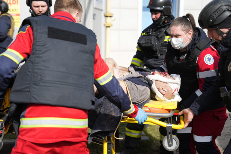 Zdravotníci evakuujú zranených po ruskom útoku na Charkov, 20. marca 2024. Foto: SITA/AP