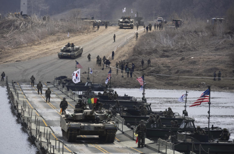 Juhokórejské tanky K1E1 sa zúčastňujú na spoločnom cvičení prechodu cez rieku medzi Južnou Kóreou a USA v Yeoncheone v Južnej Kórei v stredu 20. marca 2024. Foto: SITA/AP
