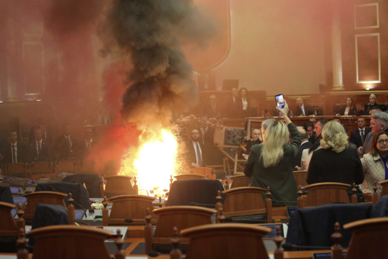 Demokratickí zákonodarcovia hádžu svetlicu počas schôdze parlamentu v albánskej Tirane. Nepáči sa im vládnutie socialistov, ktoré je čoraz viac autoritárske. Foto: SITA/AP.