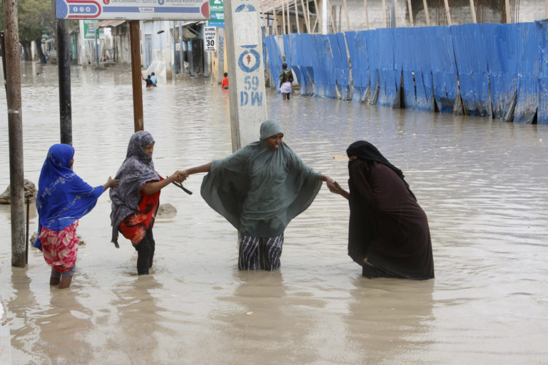 Ženy prechádzajú cez ulicu po silných záplavách v somálskom Mogadišu. Foto: SITA/AP.