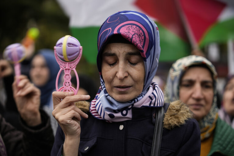 Žena plače, keď drží detskú hračku počas protestu na podporu Palestínčanov pri príležitosti Svetového dňa detí v Istanbule. Foto: SITA/AP.