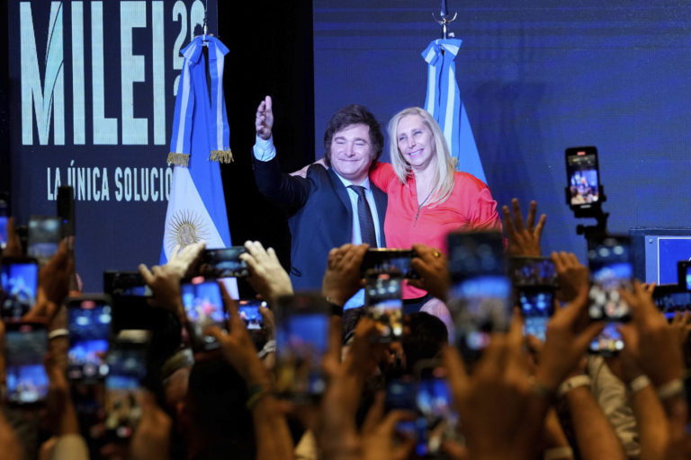 Javier Milei (vpravo) oslavuje so svojou sestrou Karinou Milei svoje víťazstvo v prezidentských voľbách v Argentíne. Foto: SITA/AP.